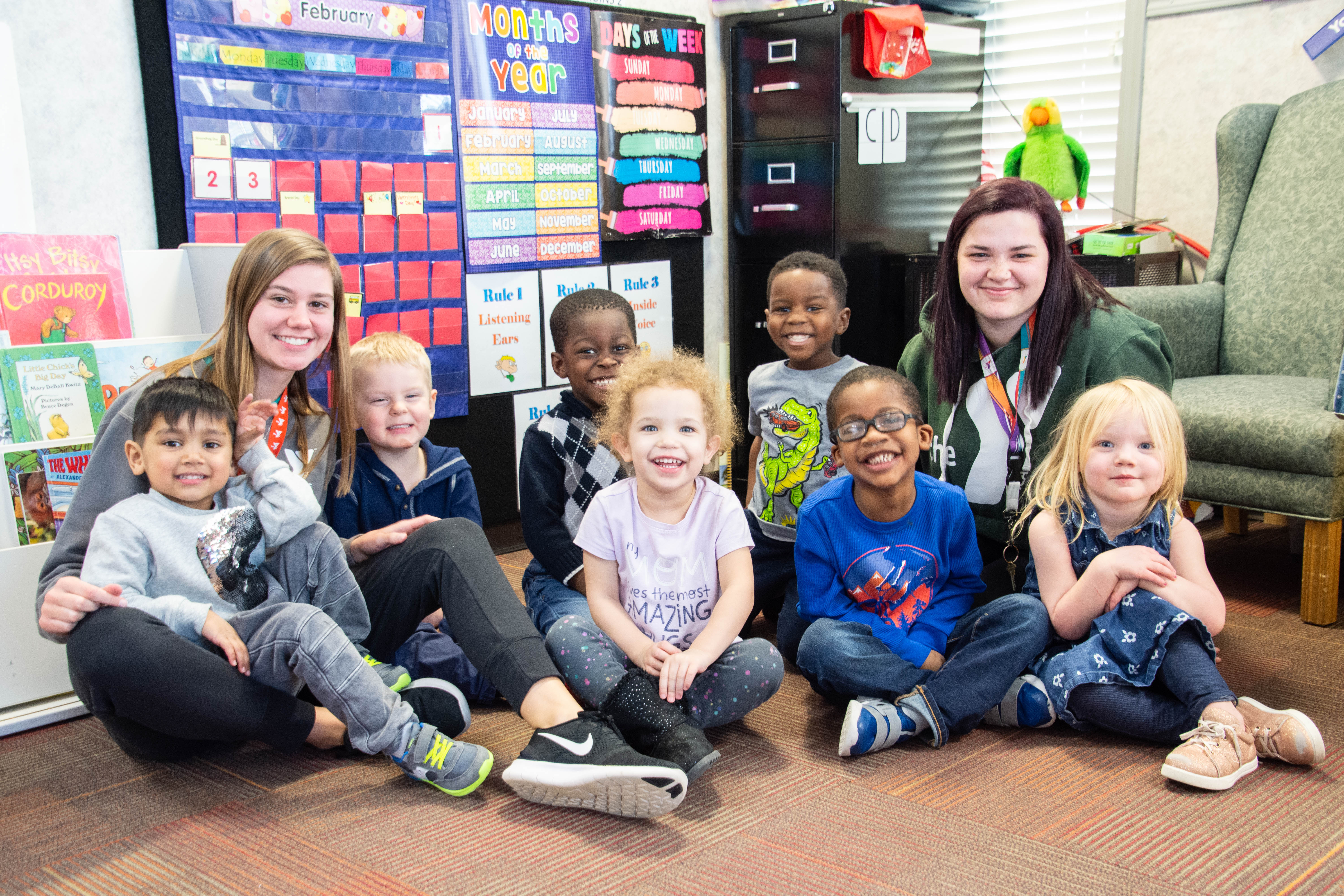 Photo shows a class at Fercho Learning Center with two staff members next to them